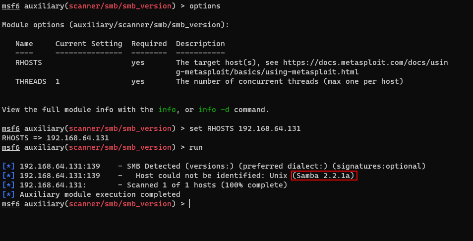 It seems the host has some known usernames and workgroup name's "MYGROUP". But we can not find the Samba's version. Let's try some metasploit script.